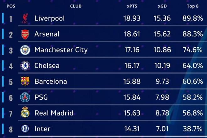 直播吧09月03日讯 数据机构Football Rankings预测了本赛季欧冠的联赛阶段前八的球队。利物浦预期积分18.93排名第一,阿森纳18.61次席,曼城、切尔西分列三四,皇马第七,国米第八,德